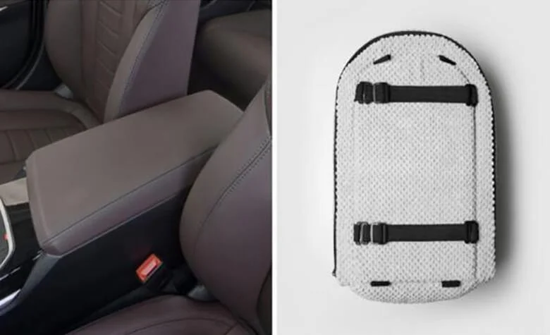 The seat has two attached straps on the bottom that securely attaches to the middle console, ensuring the seat remains still while driving.