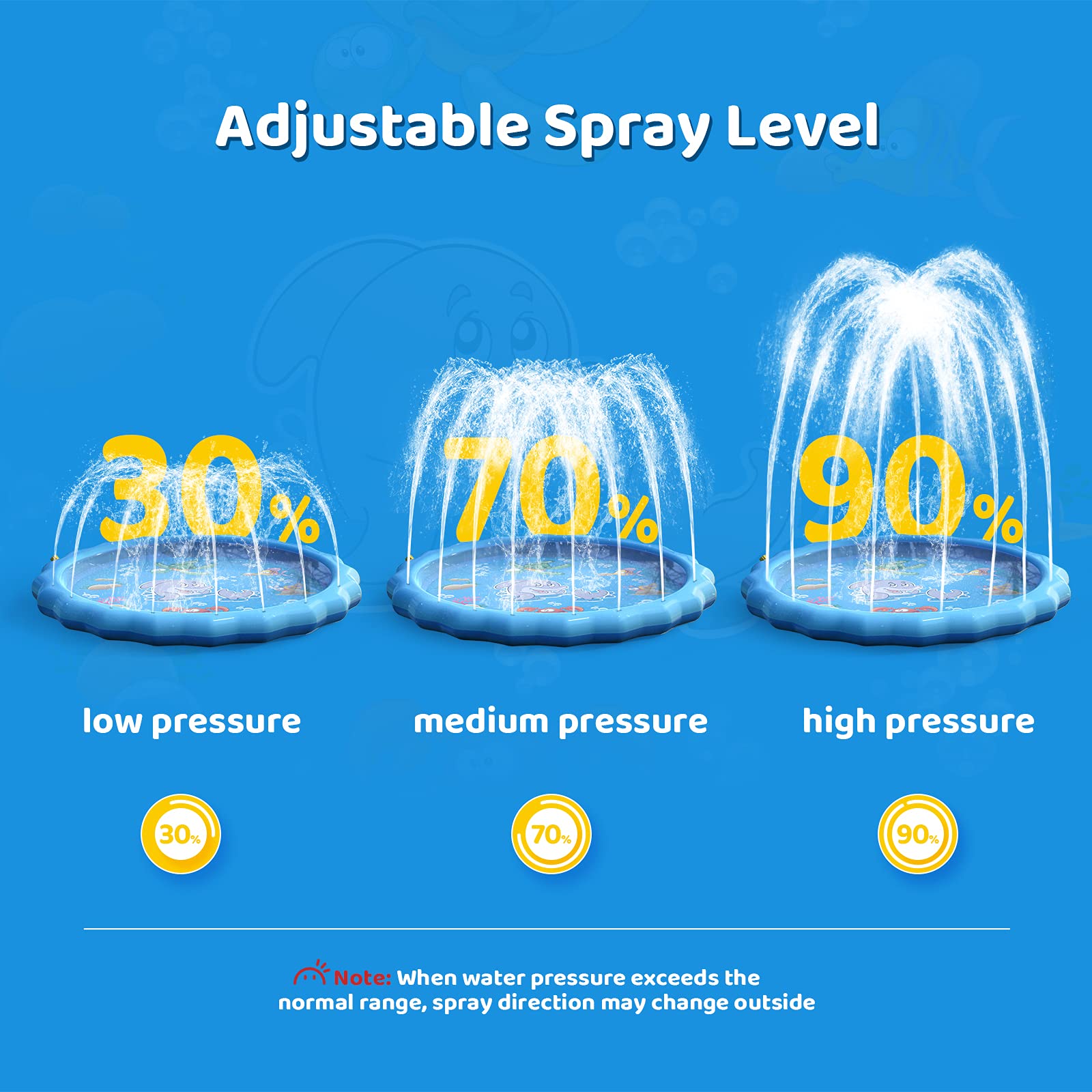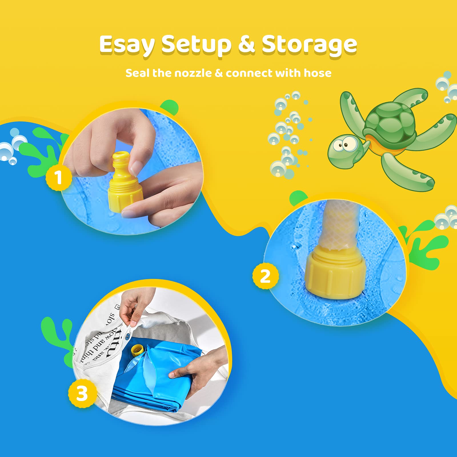 - Easy to Set Up and Storage: Plug it into any garden hose or PVC tubing and you will get a blow-up pool, simply adjust the water pressure to control the height of water streams, when you’re done, easily drain the water, wash the splash mat and hang it over to dry.