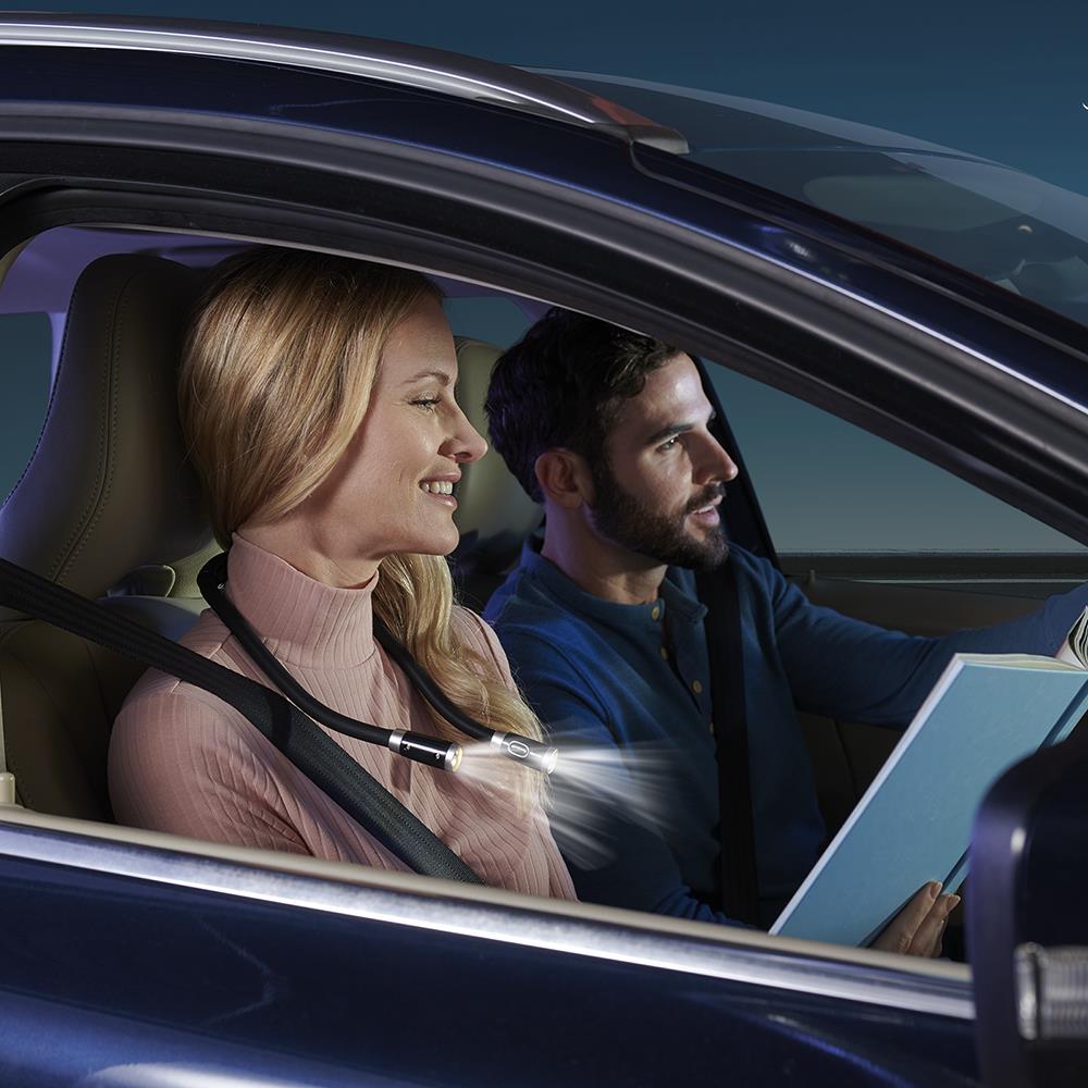 This is the hands-free light that can be worn around the neck for focused illumination. Its non-slip neck piece connects to two arms that can be shaped to direct light to a restricted area so as not to disturb others. It has two LEDs that provide 2,700-Kelvin of warm white (ideal for reading at night without disturbing a partner) and two LEDs that provide 7,000-Kelvin of cold white light (ideal for reading, knitting, repairs, dog walking, or working at night) while providing three brightness levels: spotlight, floodlight, and spot/floodlight combined. Its rechargeable battery provides up to 16 hours of operation from a 2 1/2-hour charge using the included USB cable.