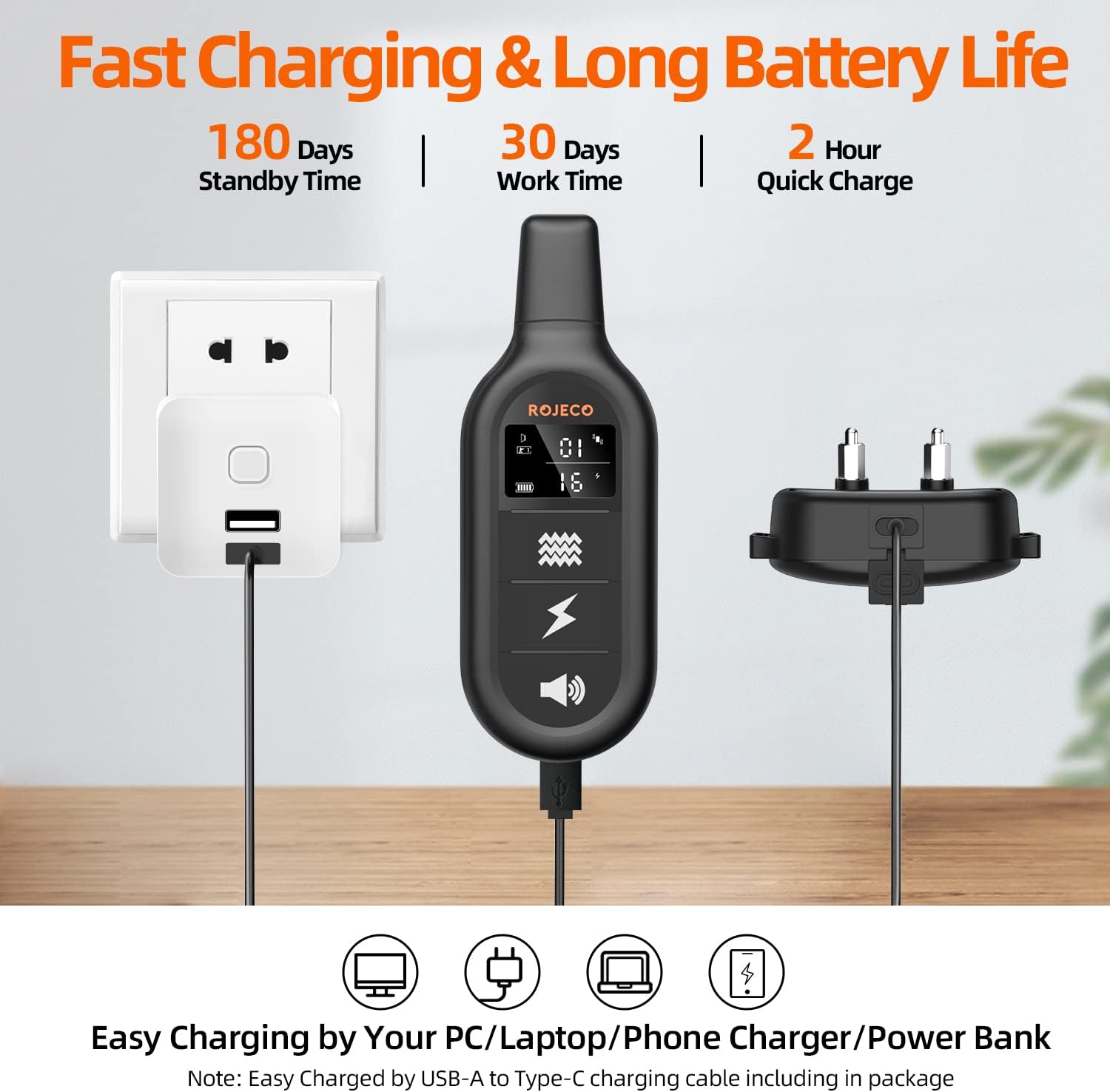 - 🐕🦺【Safe Training Even If you are a Beginner】: ROJECO cares and loves your puppy. This ecollar dog training collar is certified by FCC, ROHS, CE and conductive silicone cover Keep their skin away from irritating. Please avoid leaving the collar on dog more than 18 hours per day. Any problem, contact us via Amazon message, we will always be here to help you.